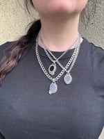 Stainless steel curb chains with sterling silver pendants and black glass cabochons